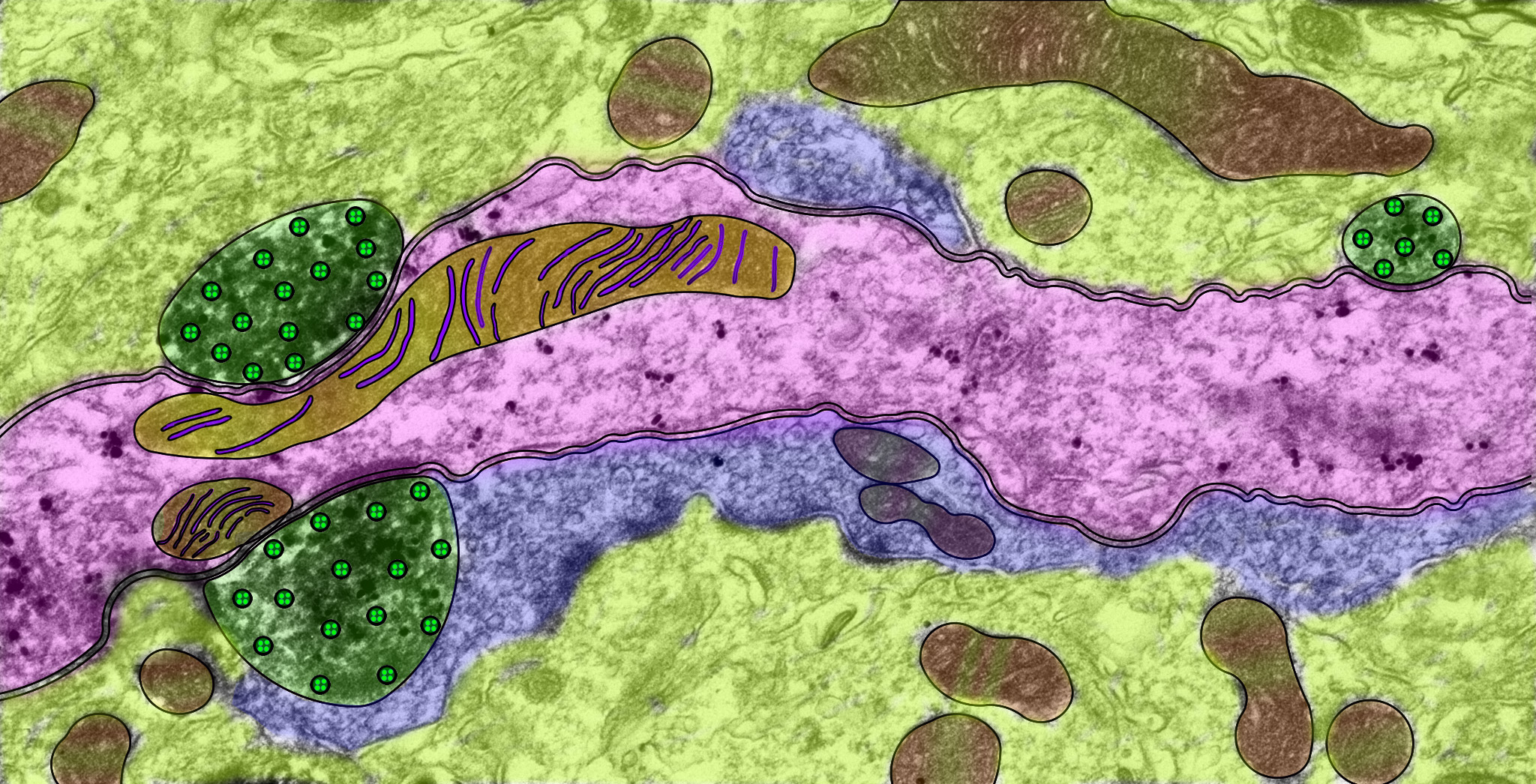 Unexpected glutamatergic excitatory axon terminals (dark green) from the ventral tegmental area make synaptic contacts on a dendrite of a parvalbumin neuron (magenta) involved in aversion. From art view, all kind of cellular organelle at ultrastructural level look like diverse groups of sea animals sadly jumping out of the contaminated river. They are not happy and rewarding! Image by Shiliang (Steven) Zhang (NIH/NIDA)