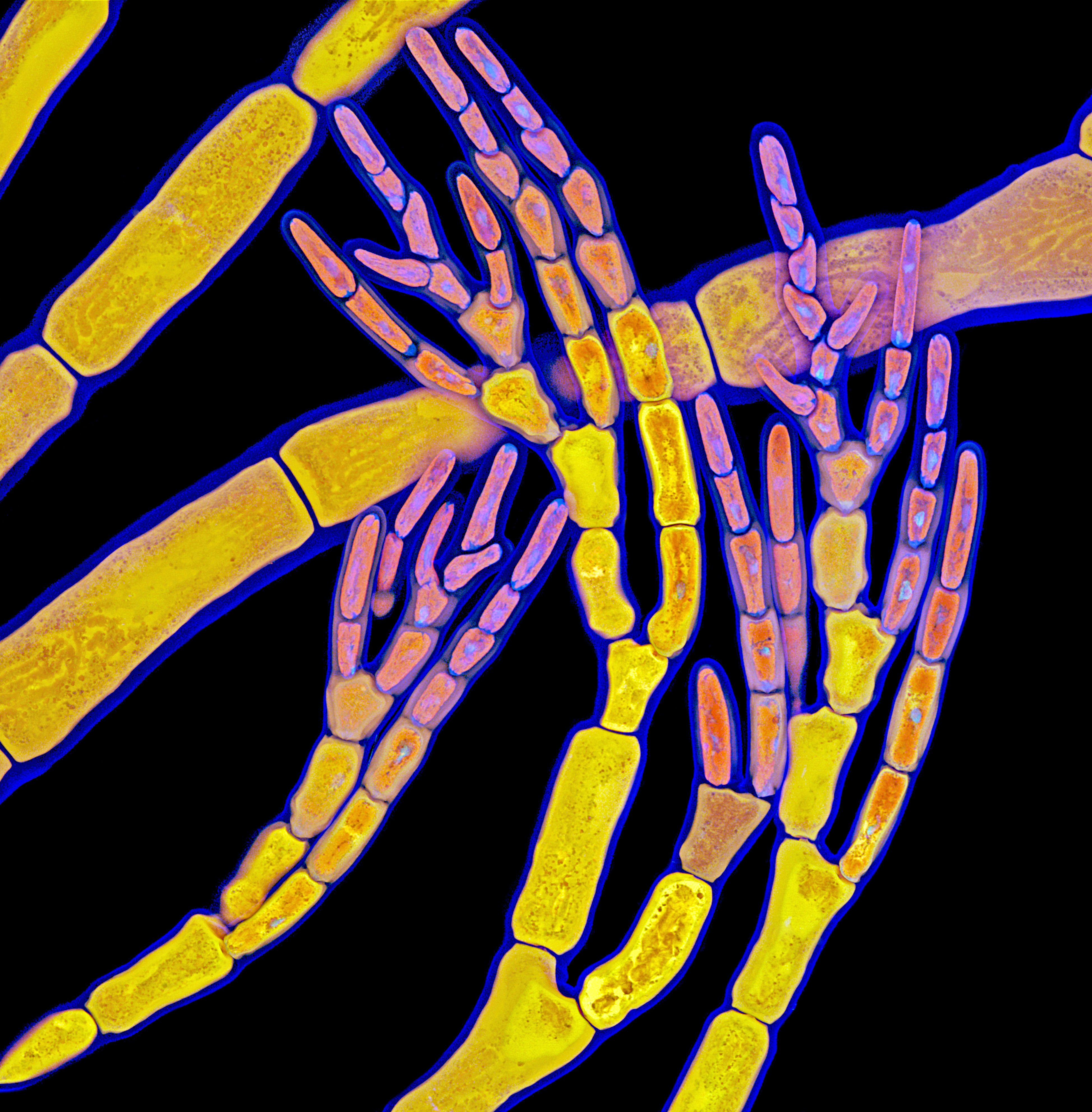 Polysiphonia, red algae, stained with acridine orange. Image collected in a Leica SP5 confocal microscope. Huygens (SVI), Imaris (Bitplane) and Adobe Photoshop were used for image processing. Image by Tagide deCarvalho (UMBC)
